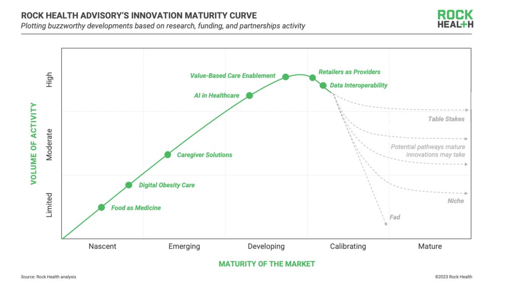 How are the trending areas in healthcare innovation faring and what should we follow closely in 2024? In their most recent insight report, Rock Health plotted seven major developments in digital health on an innovation maturity curve to help leaders find opportunities or catch up with competitors. The rankings are based on research publication volume, venture funding, and partnership activity.