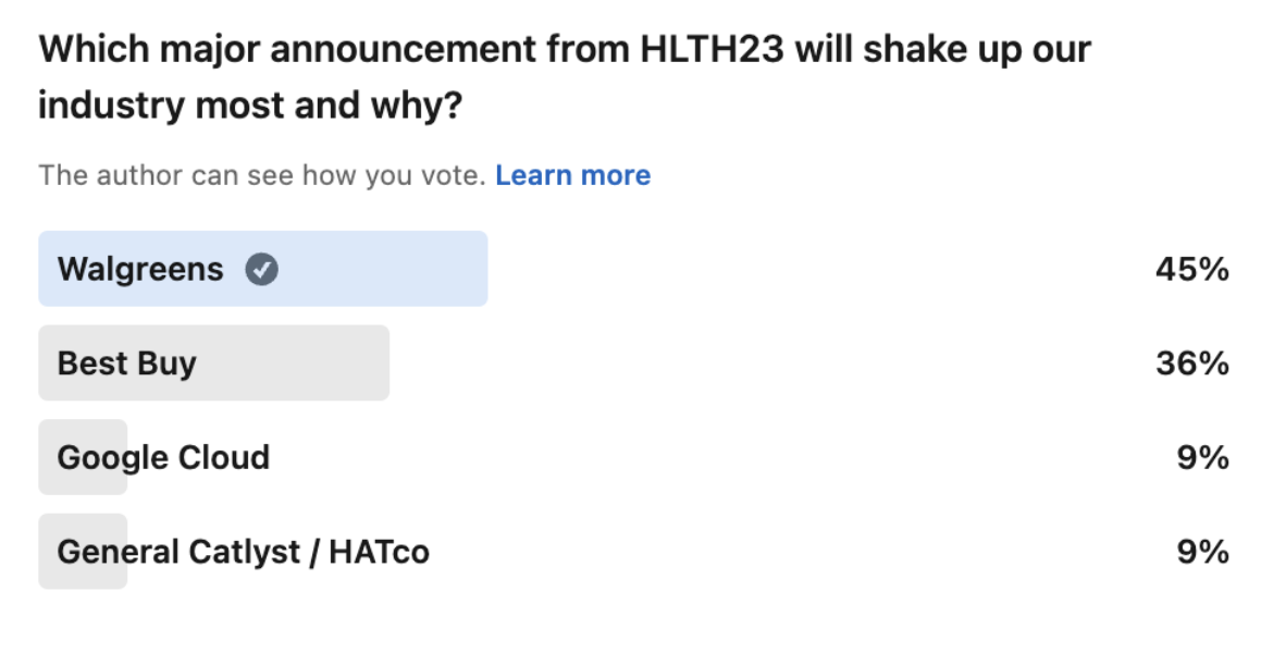 We asked our LinkedIn followers which HLTH23 announcement will make the biggest impact on our industry, and here’s how they answered. Share your thoughts in the comments.
