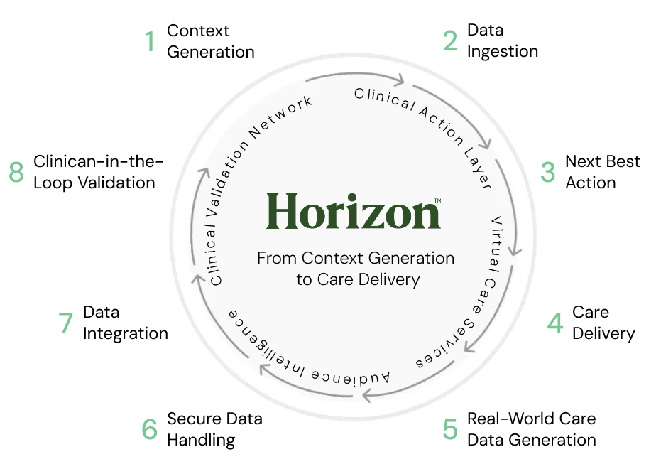 Meanwhile, every interaction generates real-world data that’s securely tokenized and structured, enabling enterprises to feed compliant outcomes back into their systems and AI models — creating a continuous learning loop. Unlike today’s narrow validation tools or point solutions, Horizon operates across real care delivery at scale with more than 50,000 visits per week and 100+ treatment areas for the biggest names in care delivery today.